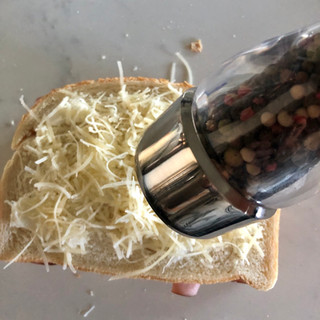 Put the sandwich together and butter the outside. Coat the butter in Parmesan Cheese and sprinkle with fresh ground pepper.