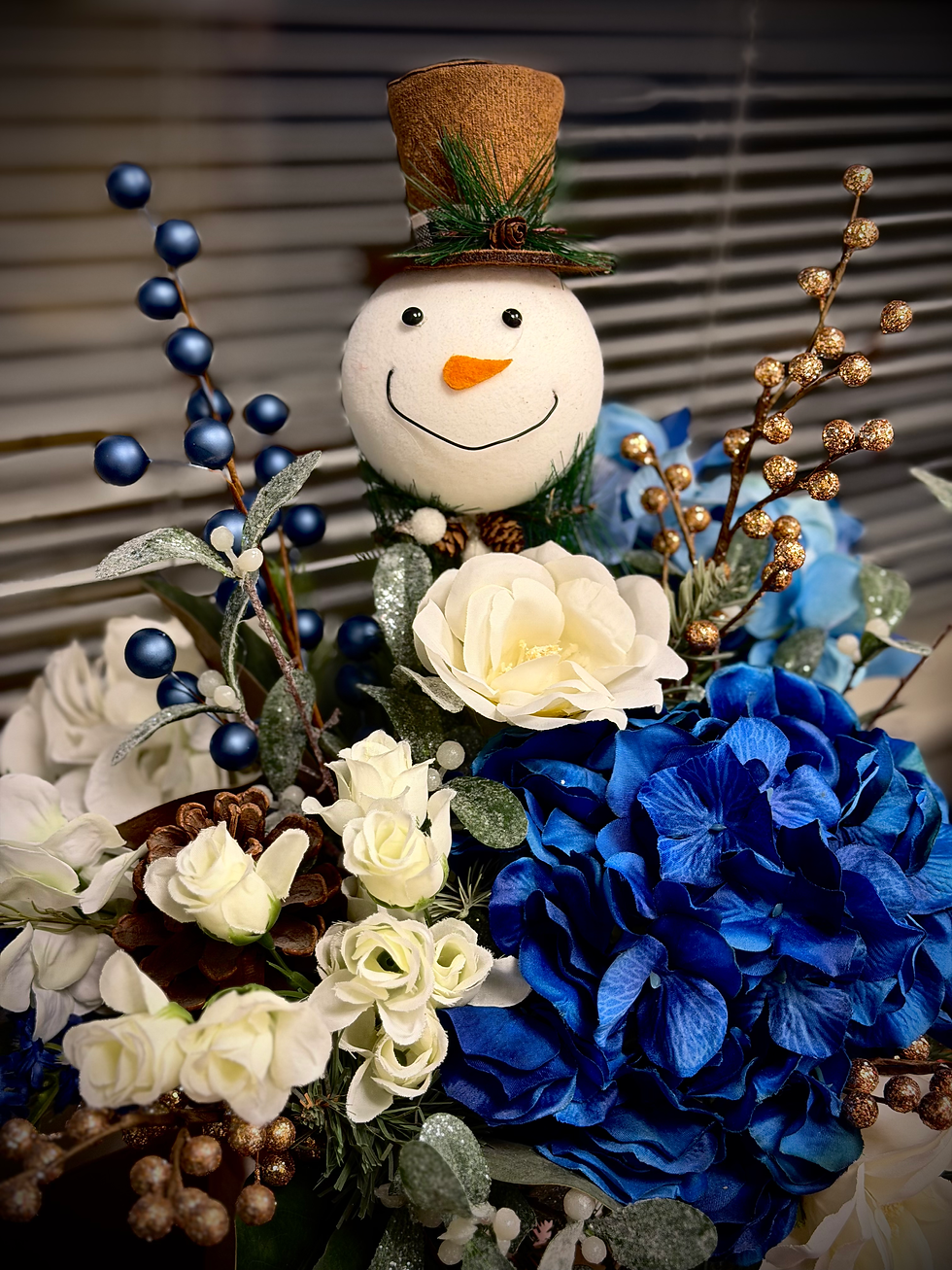 This year is hard to get excited for Christmas. We have had no snow and it hovers around 50 during the day. It has been a weird year all around moving very quickly as it seems like we blinked and Christmas was already here. With very little time to prepare I decided to create a winter floral designs for my office as I can keep that around longer. Blue and withe flower and a cheerful snowman to fight the Christmas blues.