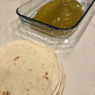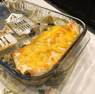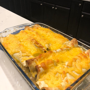On a plate dump about 3/4 cup of Green Chile Enchilada sauce. Place a flour tortilla on the plate coat flour tortilla with green Chile sauce. Place about 1/2 cup of the chicken mixture and cheese. Roll the tortilla and place in casserole dish. Continue until all of the mixture is used and the dish is filled.