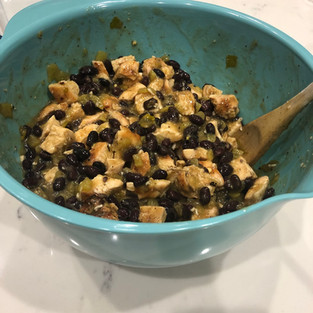 Season, grill, and cube a large chicken breast. Place in a bowl along with 1 can of drained and rinsed Black Beans, 1 can of pee, diced Green Chile, cooked Cilantro Lime Rice, 1/2 a can of Green Chile Enchilada sauce. Stir all the ingredients together.