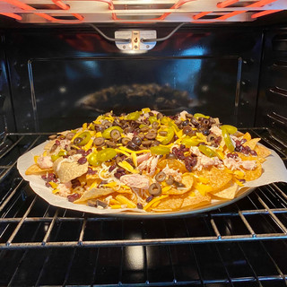 On the parchment paper place a mixture of regular tortilla chips and flavor tortillas chips. I use Regular Hint if Lime and Salsa Verde flavored Chips. Layer the chips creating a single layer. Cover in shredded Cheese And place in the oven to melt. Remove from oven and place another layer of chips upon the previous layer.