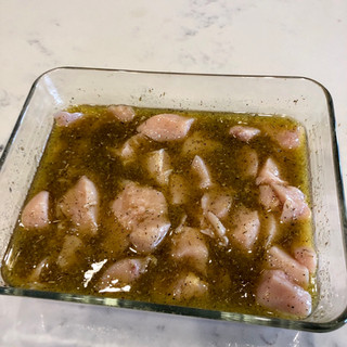Cube and bone your meat or use boneless, skinless chicken. Place in a seal able container. Pour the oil, vinegar, and lemon juice over the meat. Sprinkle the seasoning and stir until evenly distributed.