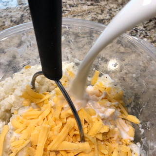 Drop spoonfuls of mash potatoes on top of gravy mixture until covered and sealed. Cover with shredded cheese and cover the pot. Simmer on low until cheese is melted.